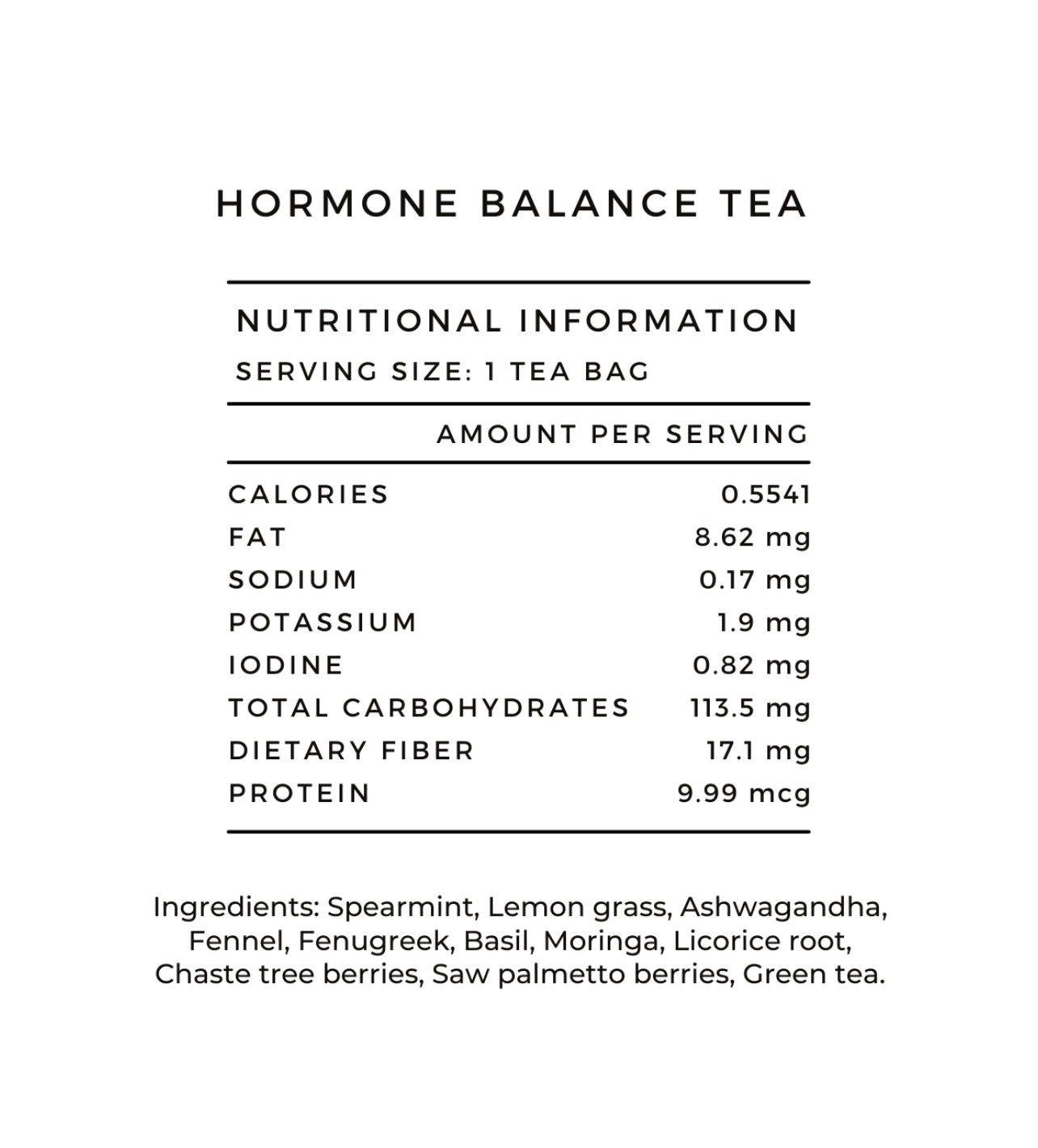 Ingredients: Spearmint, Lemon grass, Ashwagandha, Fennel, Fenugreek, Basil, Moringa, Licorice root, Chaste tree berries, Saw palmetto, Green tea. Contains no added sugar, sweeteners, artificial preservatives or colorants. Brewing instructions: